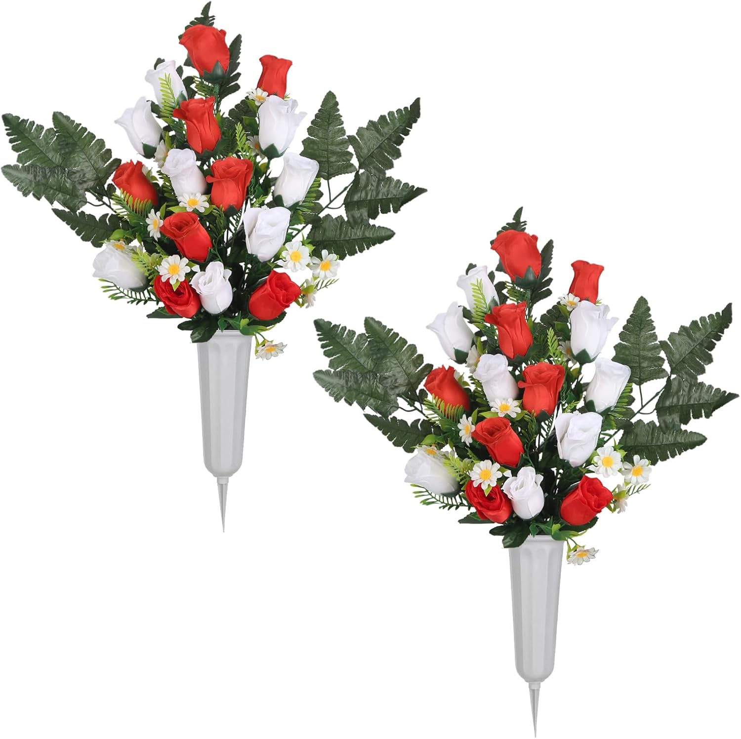 UUXX 2 Sets Artificial Cemetery Flowers Fake Rose Bouquet Outdoor Grave Decorations (White+Orange)